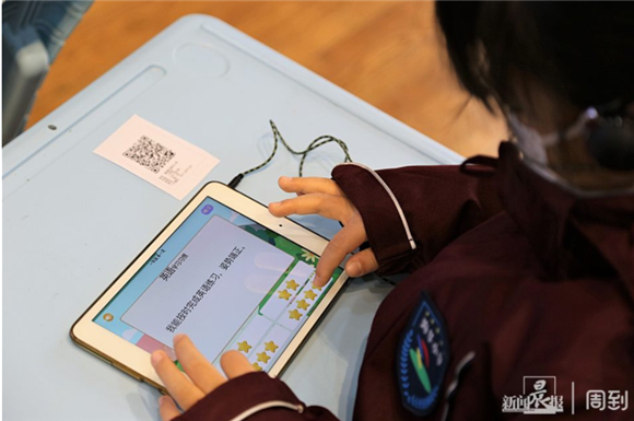 早上,海华小学室内体育馆摆放整齐的桌椅,迎来了第一批进行期末综合评价的一年级“绿娃娃”。他们每人手持一张二维码,带上耳机,在iPad上点击“开始”进入综合评价界面后,立即跳出了一个可爱的“仙人掌宝宝”:“嗨!欢迎来到沙漠观光旅游。不好!你的好朋友墨仔在被大魔王抓走了,别着急,你想救出墨仔请跟我来吧!这里是大魔王留下的脚印……”