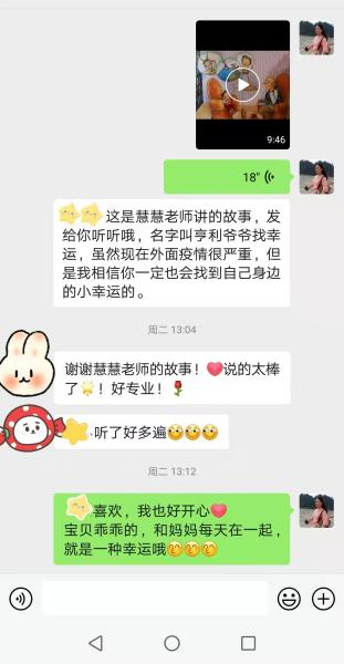 最近巧巧每天晚上都要听一遍老师专门为他录的故事《亨利爷爷找幸运》。几天前的一个晚上,虹口区实验幼儿园老师张慧接到了家长的一则短信,说小区因为疫情防控可能需要居家隔离和健康观察14天。这不禁让张慧开始担心她家的巧巧,孩子会怎么面对这一变化呢?与巧巧妈妈的交流中,张慧察觉到家长也有些许不安和紧张。于是,张慧立刻找出绘本《亨利爷爷找幸运》,剪辑录制了故事视频发给巧巧妈妈。接下来的每一天,张慧都会跟他们交流,了解巧巧及妈妈的状况,跟孩子进行互动,也希望通过交流舒缓妈妈的压力。