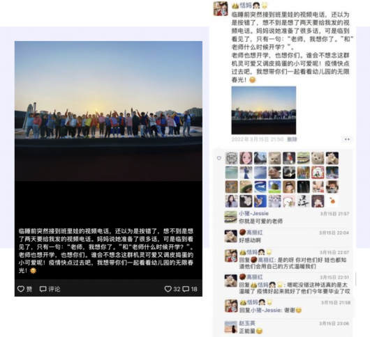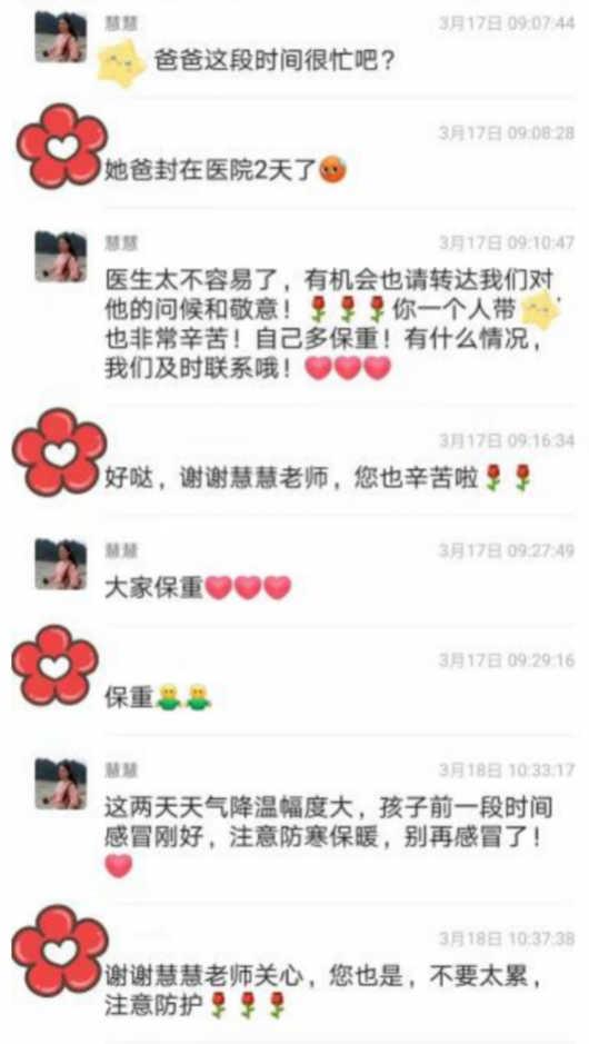 因为抗疫和隔离等原因,班级里有一些爸爸或妈妈现在只能居家独自带娃。为了这些家庭大后方的安心,张慧及时关心孩子的居家情况。特别是最近的气温像过山车一样,张慧常常点对点提醒增减衣服,提供应对感冒和咳嗽的注意事项。她说:“相比于奋战在抗疫一线的‘英雄’,我能做的事情非常有限,只希望我的孩子们在疫情当下,能够有一段暖暖的宅家时光。”