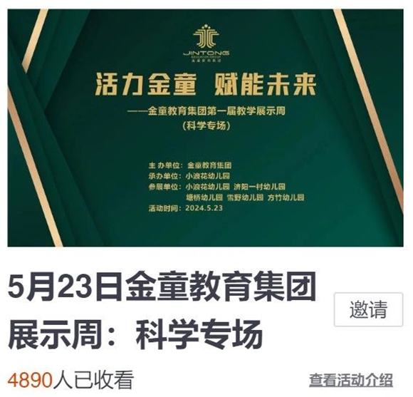 2024年5月20日-24日,金童教育集团举办第一届教学展示周。本次集团教学展示周聚焦五大领域,开设了运动、语言、艺术、科学、游戏五个展示专场,共计2次现场观摩、9次教学活动展示、17篇案例分享。全面、立体地展示集团成员校的教学研究阶段成效,促进集团内教师互动学习与交流分享。