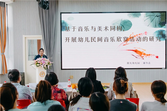 艺术专场活动在阳光幼儿园开展,阳光、方竹、灵山幼儿园三位教师展示的教学活动精彩纷呈;贝贝星、阳光、鹏飞幼儿园三位教师开展了艺术领域的教学经验分享;华东师范大学教育学部艺术教育专业副主任徐韵教授对本场活动进行专家点评。徐教授肯定了教师们的教育理念与积极尝试,鼓励教师继续坚持儿童视角,坚持推进艺术教学的实证研究,提出运用艺术通感可以丰富幼儿的感官体验与多元表达。