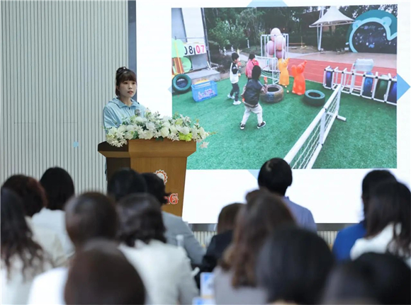 由金童幼儿园承办集团展示周首日活动任务,包括展示周开幕式及自主运动展示专场两项内容。展示现场,通过现场观摩与案例分享,凸显了集团"基于儿童视角的户外两小时活动的实践——幼儿自主运动的实践与研究"的课程共建研究成果。华东师范大学学前教育学系课程与教法教研室主任柳倩教授对运动专场的活动做专家点评。柳教授充分肯定了幼儿自主运动中采用幼儿运动量自评与教师他评相结合的操作方式以及高低结构运动整合的考量,同时建议在自主运动观察中,勿忘关注幼儿身体意识的发展。