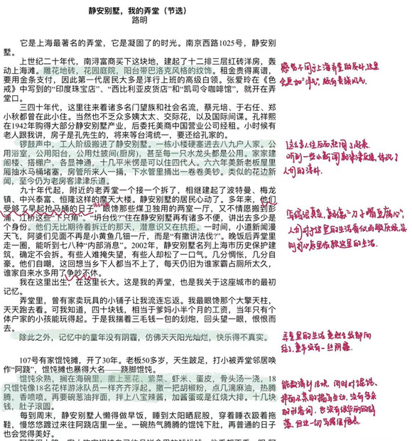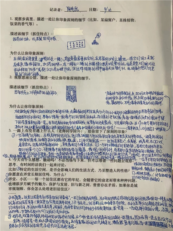 行走活动结束后,学生们纷纷写了作文,记录自己的感想。从字里行间,能嗅到他们成长的味道。有学生觉得,在紧张的学习生活中体会到了“从前慢”的静谧美好,决心在匆忙的日常中放慢脚步,多发现沿途的小美好。有人担心弄堂上空那一圈圈电线在下雨天会否有安全隐患——这是一个关注民生的孩子,提出一个值得在物理方面再作探究的问题。有人跟自己的父母、爷爷奶奶聊了聊他们的弄堂往事,对当年在弄堂里滚铁圈、跳房子,用凉水泼洒地面降温,吃井水浸西瓜消暑的生活心向往之,拉近了与长辈间的距离。每个人都获得了一个有真实感触的、与众不同的作文素材。