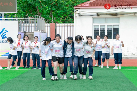 运动员们五人一组,齐心协力,凝聚一条心,拧成一股绳,团结一心直冲终点!