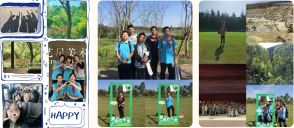 集体课程结束后,同学们开启了愉快的小队自由活动。大家都觅得一方惬意小天地,纷纷拿出各式各样的新鲜水果和美味零食,毫不吝啬地互相分享,空气中弥漫着幸福的味道。温和的秋阳透过公园内树木的层层枝丫,撒下斑驳的光影,一束束微光照射在那一位位青春少年的脸颊之上,展现着一种独属于秋季的生机与活力。以下是参与本次社会实践考察活动的"优秀活动小队":