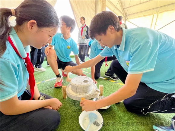 接着,同学们来到了传统石磨坊,导游先向同学们介绍了豆浆的历史和制作流程,介绍结束后,同学们分小组开始动手实践,他们将浸泡好的黄豆放在石磨上,然后用力推动石磨,让黄豆在磨盘中慢慢磨碎,释放出豆浆,清澈的豆浆从磨盘中缓缓流出,同学们的脸上都洋溢起来满足的笑容。