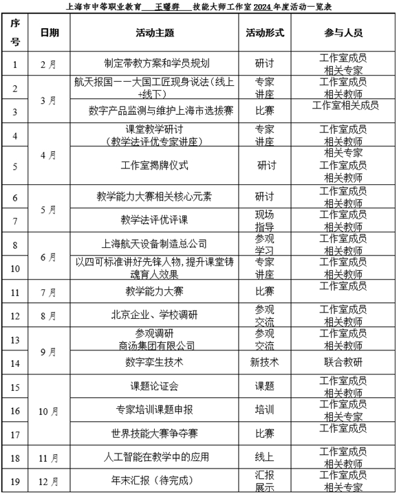 (三)组织团队交流与合作通过组织学员外出观摩交流、邀请国内外行业专家和教育专家讲座、安排企业一线调研与实践,结合工作室科研项目,为学员提供科研教学平台,提升国际视野和上海市中职教改的高度思考、探索、践行。同时,加强与其他企业、高校和科研机构的合作,开展产学研合作项目,促进团队整体技术水平的提升。