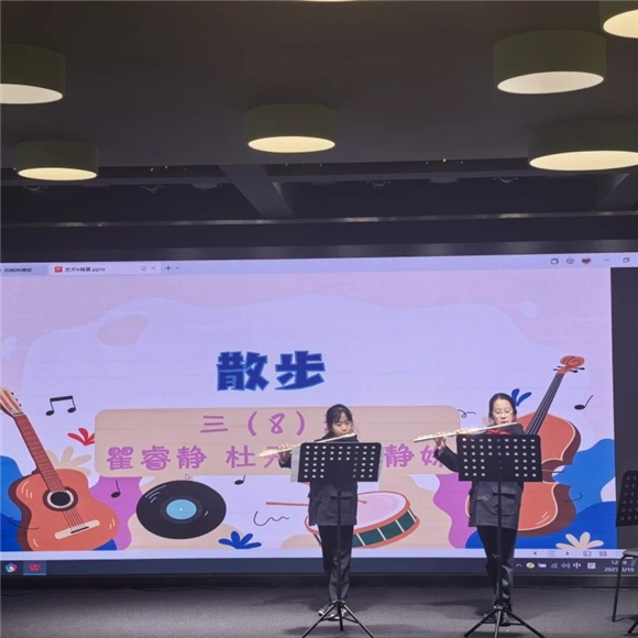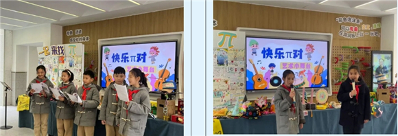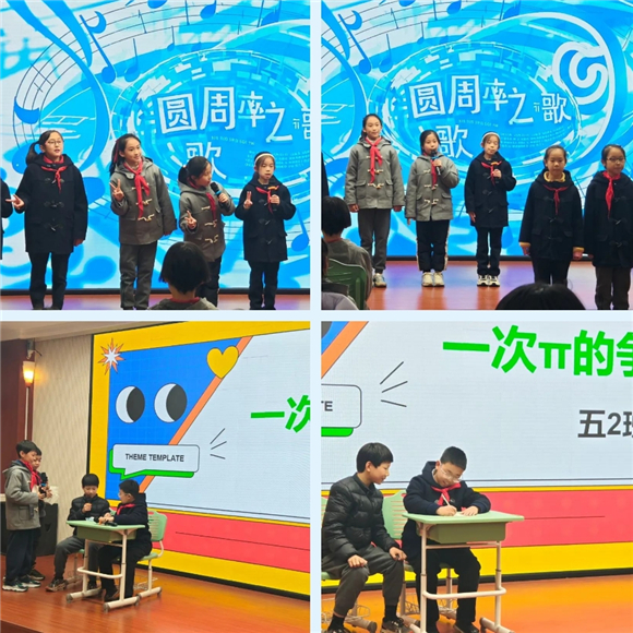 张杨校区的校园里也同样洋溢着数学与艺术碰撞的火花。在艺术π的展演小舞台上,小笋芽们通过多元的形式展现了数学之美。童声朗朗的π之歌、用肢体语言生动演绎的圆周率奥秘、以幽默的方式重现古人计算圆周率过程的小品……在学科融合的实践中,孩子们在艺术创造中感受数学的魅力,培养了跨学科思维能力和创新意识。