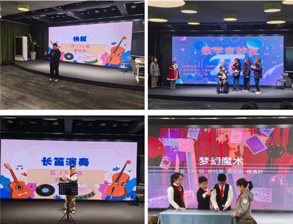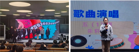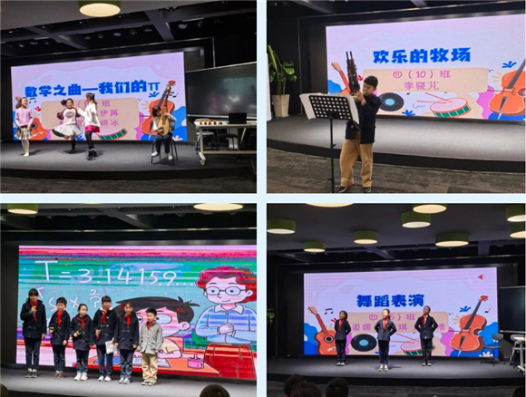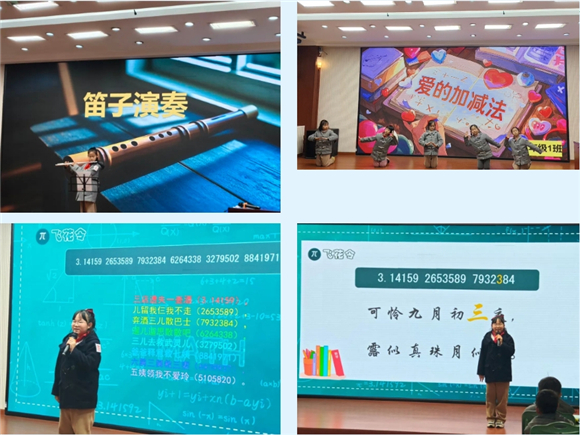 笛声悠悠流转π的韵律;吉他弦上跳跃着π的节拍;快板脆响间飞出圆周率的无限不循环;童谣婉转中藏着数学王国的奇妙密码。舞台上的小艺术家们用十八般才艺诠释数学之美。优美的舞姿勾勒出完美的圆,声情并茂的朗诵演绎着数学家的故事,童趣盎然的原创儿歌让计算公式变得朗朗上口。