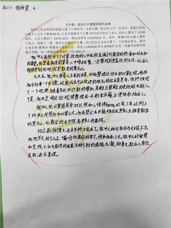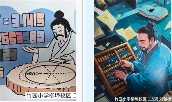 在这次活动中,学生了解到祖冲之靠纸笔一点点计算,直到计算了正12288边形和正24576边形的边长,才得出圆周率在3.1415926和3.1415927之间。这份精神被学生们用画笔生动地描绘出来。