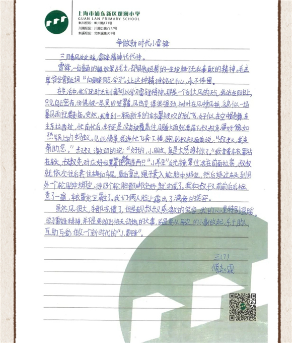 三月暖阳映初心,雷锋精神代代传。为弘扬雷锋精神,深化新时代爱国主义教育,观澜小学以"三月春‘锋’暖人心"为主题,组织开展了形式多样的学雷锋活动。五年级学生以书法寄情,三年级学子以日记铭志,校园内掀起"学榜样、践行动"的热潮。优秀书法、硬笔字作品及雷锋主题日记在校园集中展览,以艺术与文字交融的方式,让雷锋精神浸润童心。