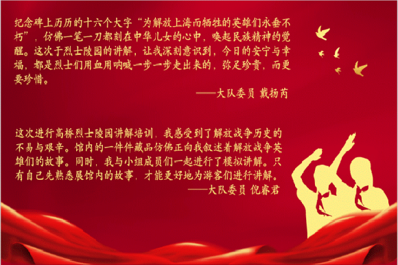 此次培训特别安排了经验丰富的资深讲解员带领浦模学子们走进高桥烈士陵园的各个展室。在一幅幅珍贵的历史图片、一件件承载着历史记忆的文物前,资深讲解员生动地讲述着高桥地区的革命故事,从战火纷飞的战斗场景到烈士们可歌可泣的英勇事迹,让浦模学子们身临其境,对高桥的红色文化有了更为直观、深刻的感受,也为他们后续的讲解提供了丰富的素材和灵感。培训结束后,浦模学子们收获颇丰。纷纷表达了自己的感受。