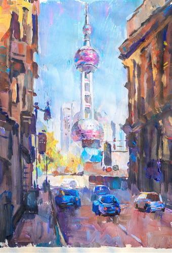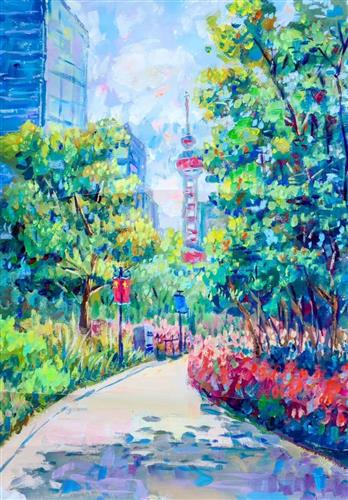 选择东方明珠作为主体时,我注意到电视塔在不同时间段的光影变化比想象中更快。江面的反光与云层移动导致投影位置频繁改变,所以必须在起稿阶段就规划好基础明暗关系。周围的现代建筑群以几何块面为主,与自然生长的树木形成有趣对比,我尝试用不同的笔触来区分混凝土结构与植物肌理。