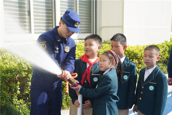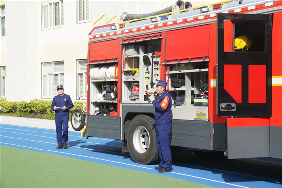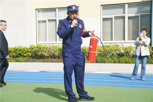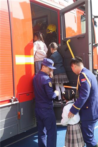 当天正好是张杨校区的消防安全逃生演习,学校还特地邀请了铜山消防救援站的领导和消防战士,消防车也开进了校园。小萌新见到了巨大的消防车,无比兴奋。消防员叔叔们通过沉浸式教学和生动有趣的互动演练,给大家上了一堂直观且极具教育意义的消防安全课。大班的小朋友们第一次与消防车、消防员叔叔近距离接触,要勇敢的信念在心中萌发。