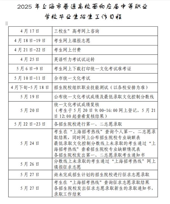 已完成网上志愿填报的考生须于4月21日9:00-22:00至4月22日9:00-12:00期间,登录网站完成网上付费。完成付费的考生可于5月6日-9日登录"上海招考热线"网站自行下载打印统一文化考试准考证。
