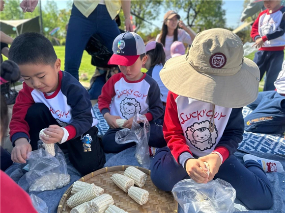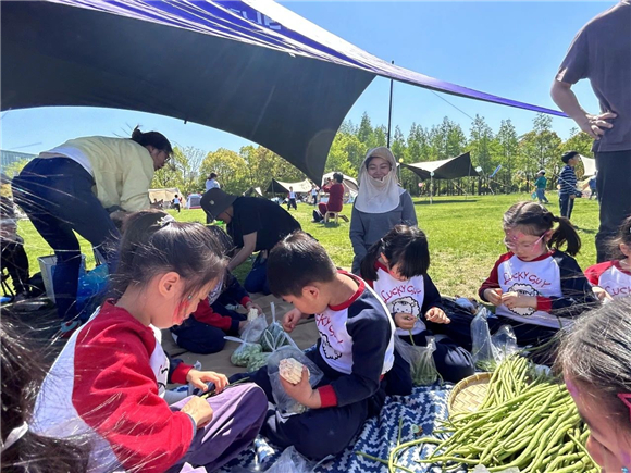 春日时令手工坊内人头涌动,鲜嫩的时令蔬菜让孩子爱不释手。剥开翡翠般的蚕豆荚,粒粒珠玉滚落掌心;摘下弯月似的长缸豆,藤蔓还沾着晨露的微光;嫩绿草头在手指尖舒展清香,玉米苞叶裹着甜糯的秘密。