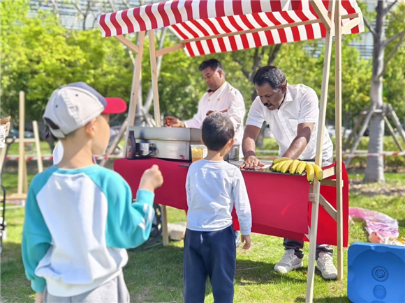 今天美食街的每个摊位都是味觉的魔法阵。印度飞饼师指尖旋舞,面饼如银月凌空翻转,裹住水果的甜与面团的柔,好手艺啊!两小时中完成了70多个印度飞饼。印度师傅说:"如果我天天有这么好的生意,一定会发财。"