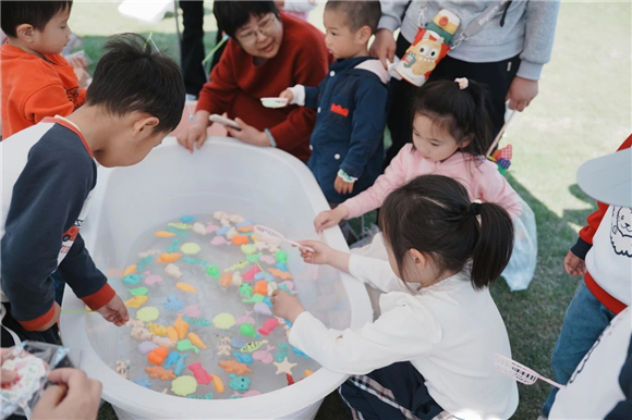 十重"童趣秘境"让孩子们乐此不疲——九宫格足球划出彩虹弧线,小小少年们用脚尖叩响春日的门环;滑草拖车载着欢叫俯冲,全家共享天伦之乐,陪伴是最长情的告别。充气鱼池也是孩子们的最爱,一根钓杆、一尾小鱼,孩子们徘徊池边,静候那抹跃动的身影——我的小小战利品;夹弹珠比赛一轮接一轮,孩子们运用筷子的能力出神入化、炉火纯青。机灵的"小地鼠"探出脑袋偷尝春光,转眼又被木槌敲成俏皮的音符。小顽童们眼巴巴排队等在套圈圈,心里默念咒语"圈圈你要听话哦,让我套住它!"最是风筝扶摇处,恰似春天里肆意奔跑的快乐心情!