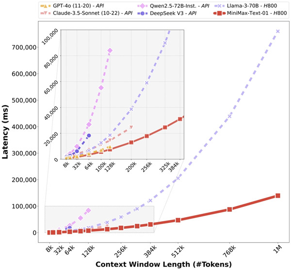 和全球先进模型相比,随着上下文窗口变长,MiniMax-Text-01的推理延迟上升缓慢。