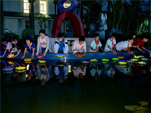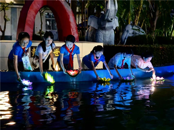 放水灯是泼水节的一种祈福仪式,不仅表达了对水的敬畏,也寄托了人们心里的小小心愿。待夜色降临,一盏盏精美的水灯漂浮在小街中心小学心愿池内,见证着“沪滇友谊”,寄托着师生们对傣历新年节的美好祝愿。