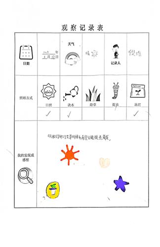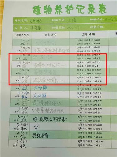 翻看小匠们的养护记录表发现:有小组每天浇水4次,在种子发芽期间,只要保证2-3天浇水1次,并浇透土壤就可以了。