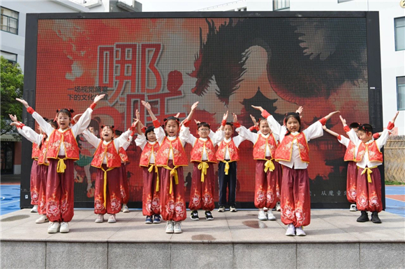 开幕式在一、二年级同学们热情洋溢的热场表演《哪吒》中开场。舞台上,小哪吒们脚踏风火轮、手持乾坤圈,充满了活力与灵动。他们时而跳跃,时而旋转,将哪吒的勇敢无畏展现得淋漓尽致,也带我们走进了一个充满神话色彩的世界,感受传统文化的魅力。