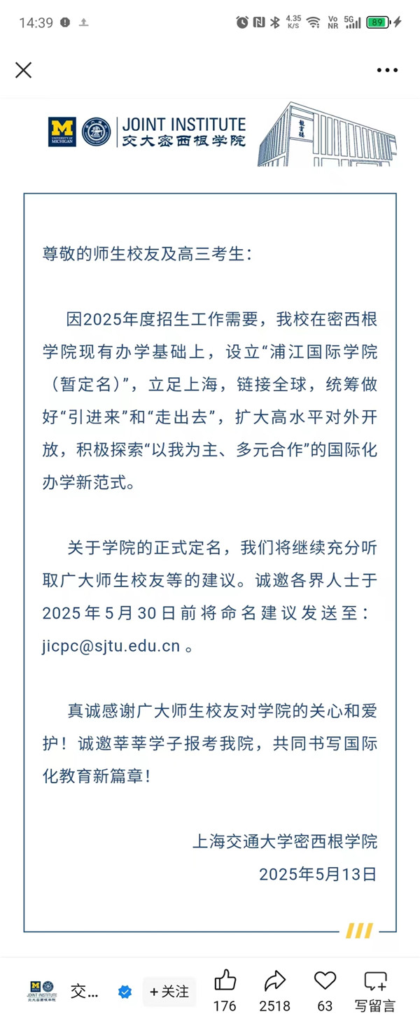 5月13日),上海交通大学密西根学院官微挂出一则通告,宣布“因2025年度招生工作需要,我校在密西根学院现有办学基础上,设立‘浦江国际学院(暂定名)’,立足上海,链接全球,统筹做好‘引进来’和‘走出去’,扩大高水平对外开放,积极探索‘以我为主、多元合作’的国际化办学新范式。”