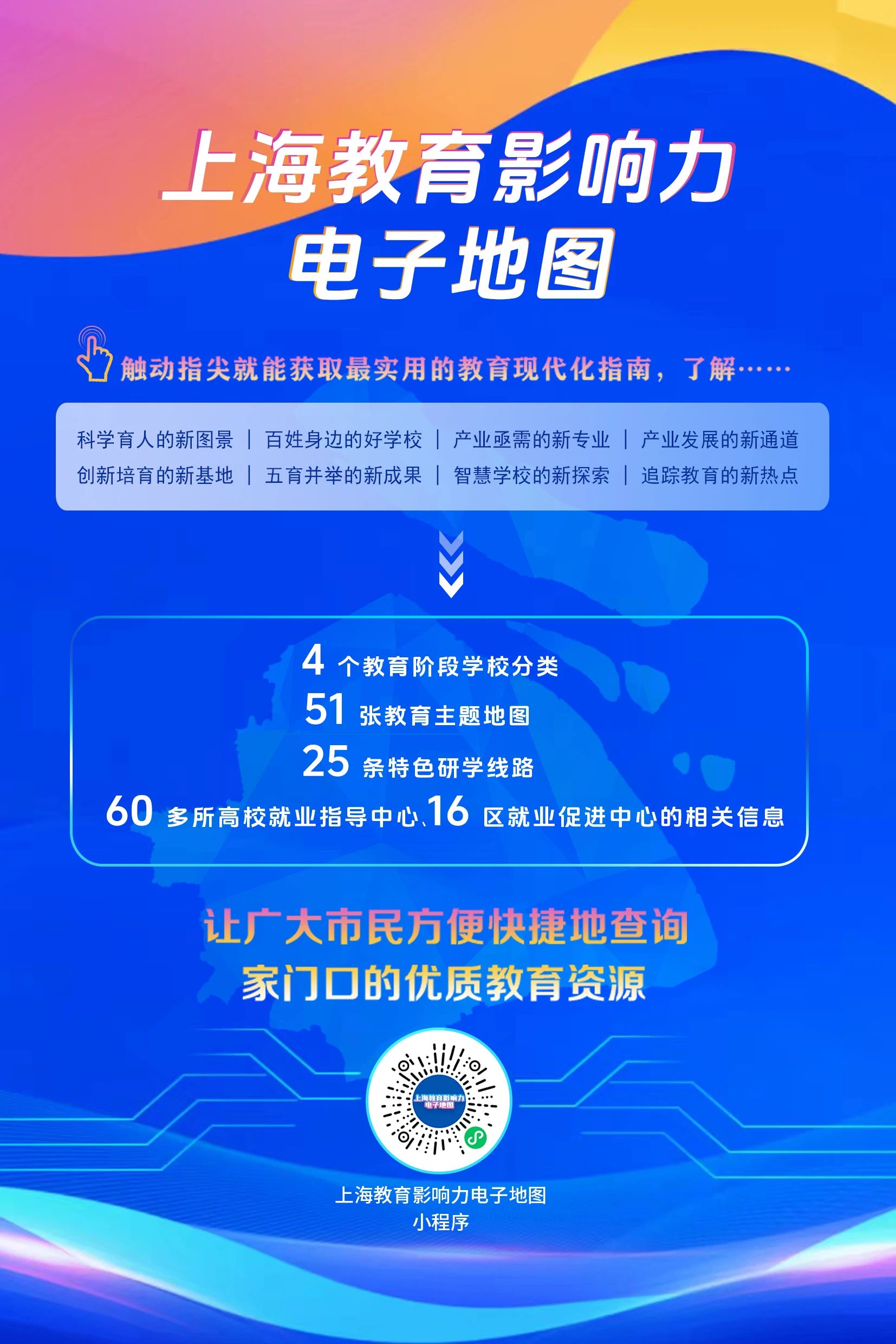 今年,"上海教育影响力电子地图"将围绕89所"上海市人工智能教育实验校"推出新图谱,并对地图资源进行全面整合,推出全新的"AI+教育特色"分类。借助人工智能技术强化并完善图谱应用功能,加快形成以数据库为支撑的高质量地图体系,为市民提供更高效、更便捷、更精准的教育服务。