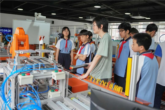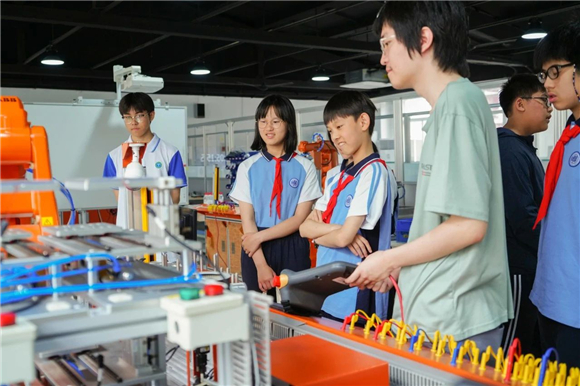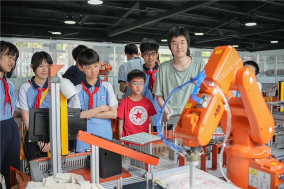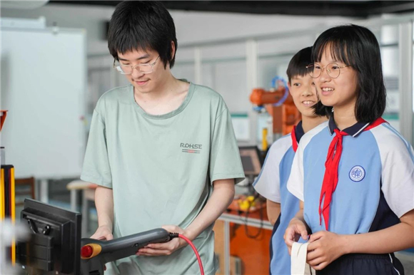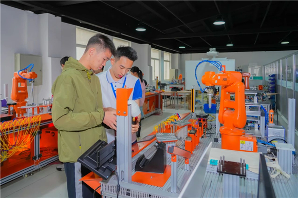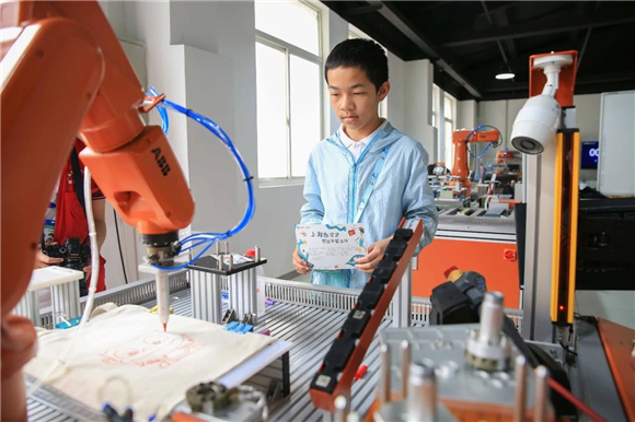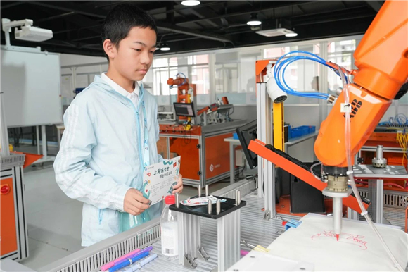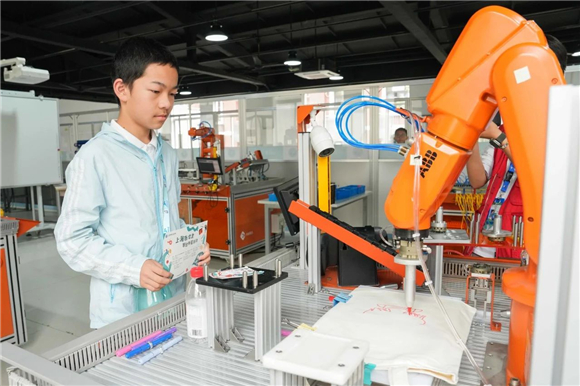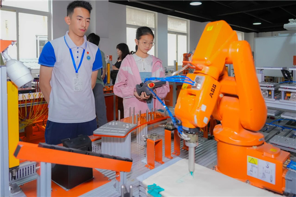 "智控节拍·码动未来"项目依托学校智能制造实训平台,让同学们体验工业机器人技术的魅力。通过"代码指挥官"编程实践、"虚拟工厂仿真系统"操作以及"智能车间探秘"等环节,同学们掌握了基础编程逻辑,再通过机械手在环保布袋上绘制动漫人物"哪吒",感受到数字化制造流程的奇妙,为智能制造领域的职业梦想埋下了种子。