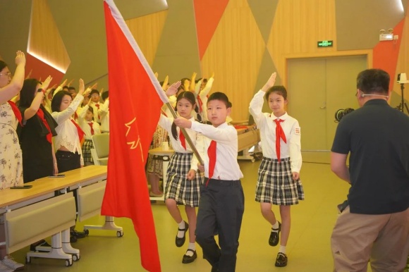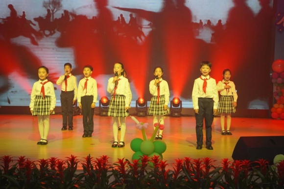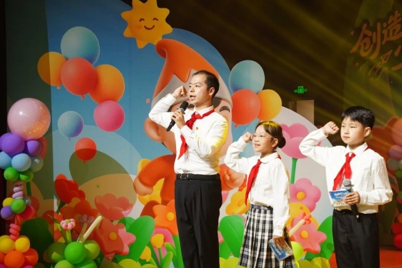 丽园朗诵社团深情演绎主题朗诵《创造吧!少年》,以清脆童声拉开序幕。鲜艳的队旗在出旗曲中庄严入场,全体少先队员高唱队歌,用嘹亮的歌声宣告节日的喜悦。