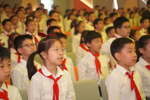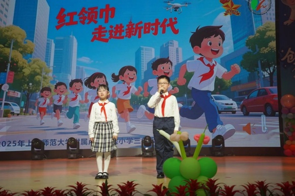 三年级学生以《红领巾之歌》致敬建队76周年,系红领巾挑战赛的成果化作舞台上的整齐展演,领巾飘扬间尽显少先队员们的责任与担当。