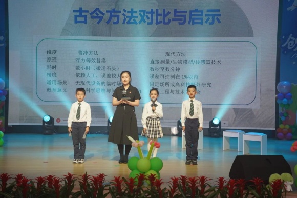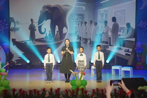 二年级学生带来了创意节目《曹冲称象谈古论今》,让AI技术对话中华经典故事《曹冲称象》,用创新思维破解称重难题,经典故事在现代科技的加持下焕发新生。