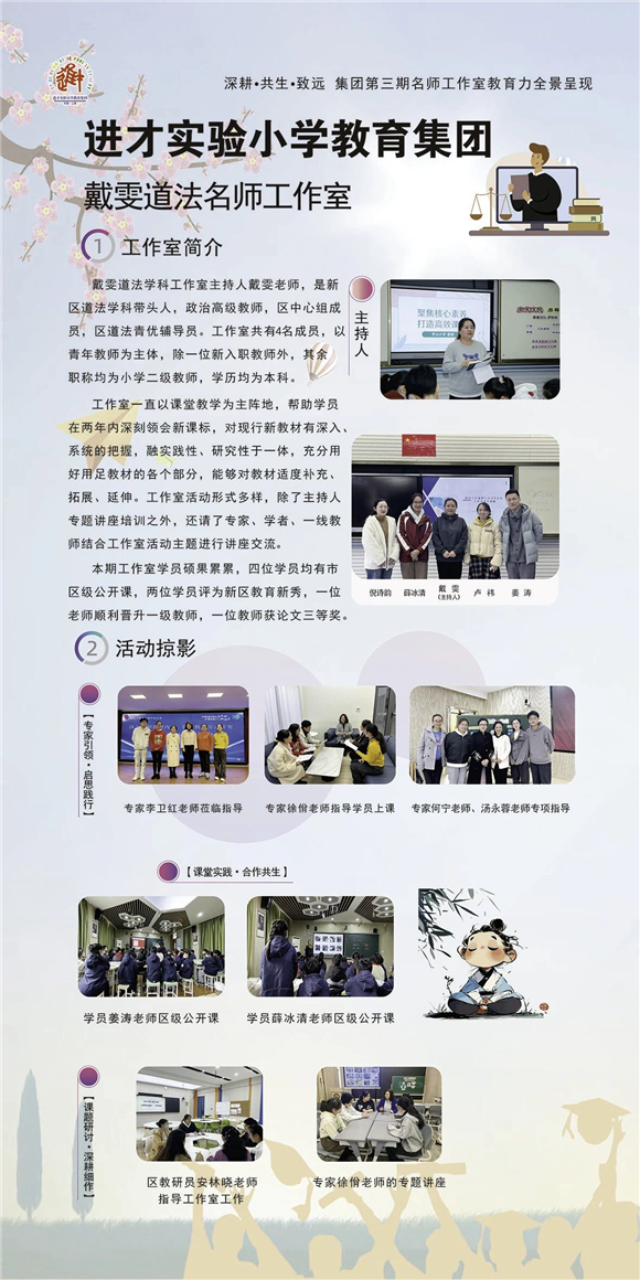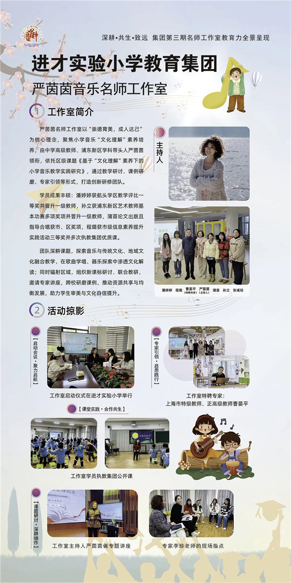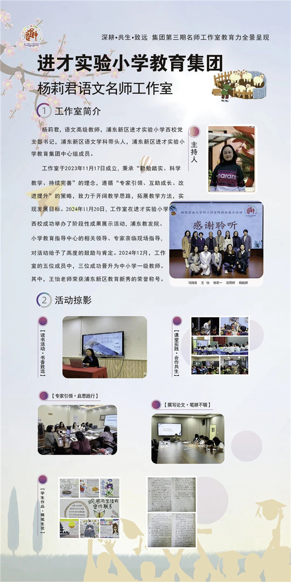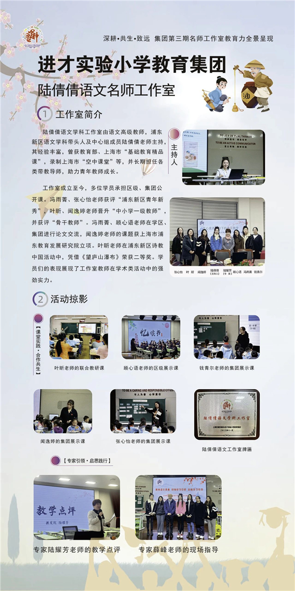 为进一步激发进才实验小学教育集团教师专业发展的内驱力,不断培育和扩大集团区级学科带头人、区级骨干教师、中学高级教师等高端教师队伍,造就一支以"高端名师"为龙头,以"四有"教师为中坚,以青年新秀、骨干后备为后浪的具有现代教师素质和创新精神的新型教师队伍,进才实验小学教育集团第三期名师工作室于2023年11月正式成立。集团名师工作室借鉴区级名师基地、学科工作坊的运作模式,采用"双导师"制,开展学科团队主题研修,提升教师的教育教学技能,孵化和培育集团名师,储备骨干后备,名师工作室在近两年项目化实施过程中成绩斐然,已有7位工作室主持人获评"浦东新区学科带头人"称号。