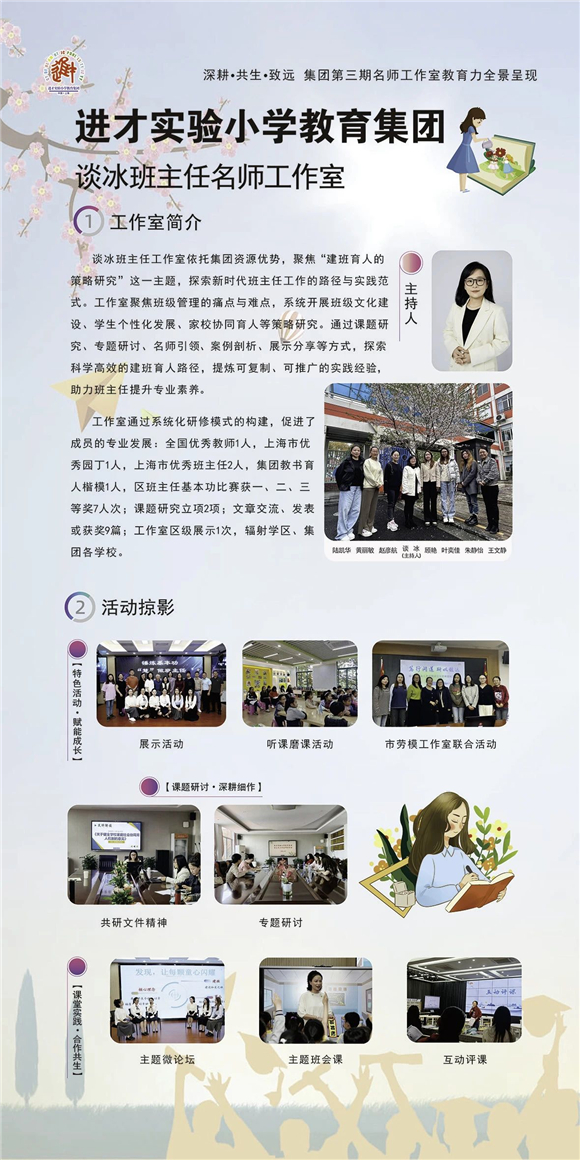 谈冰班主任名师工作室聚焦"建班育人的策略研究"这一主题,探索新时代班主任工作的路径与实践范式。工作室聚焦班级管理的痛点与难点,系统开展班级文化建设、学生个性化发展、家校协同育人等策略研究。通过课题研究、专题研讨、名师引领、案例剖析、展示分享等方式,探索科学高效的建班育人路径,提炼可复制、可推广的实践经验,助力班主任提升专业素养。工作室通过系统化研修模式的构建,促进了成员的专业发展:全国优秀教师1人,上海市优秀园丁1人,上海市优秀班主任2人,集团教书育人楷模1人,区班主任基本功比赛获一、二、三等奖7人次;课题研究立项2项;文章交流、发表或获奖9篇。