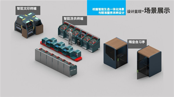 参展作品中,有一款设计旨在推进校园智能系统的一体化标准建设,进一步为未来新建高校的服务系统搭建提供了一定参考,还引入高校宿舍场景的智能化升级课题。具体包含三个智能服务终端,其中智能文印终端设计结合了服务预约与感知;而智能洗衣终端针对于洗衣高峰情景对结构进行改造优化,设置净衣自动收集硬件、“备洗”储藏空间,降低高峰人员流动;智能隔音亭则针对于发音宽容空间应用的设施,配备主动降噪系统。