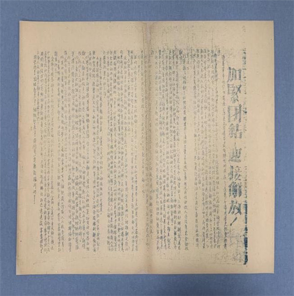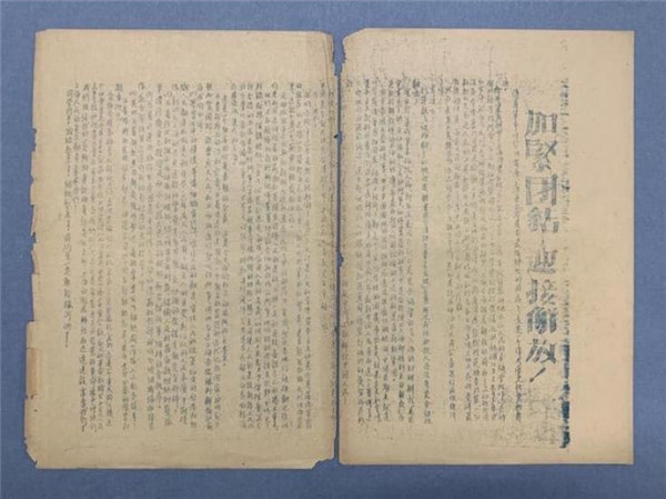 修复前的宣传品“加紧团结、迎接解放”纸张老化、泛黄、发脆,有黄斑、污迹,周边局部破损、残缺,中间断裂一分为二。修复后宣传品形成统一整体。