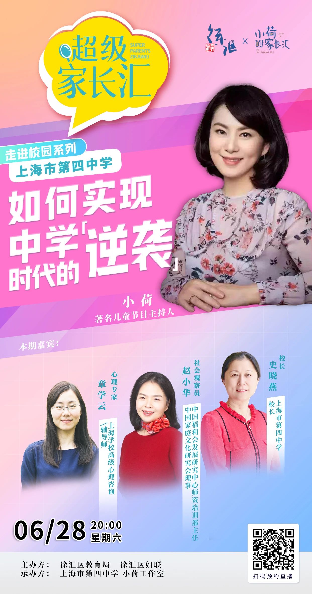 中学是孩子行为、习惯、品德、意志初步形成的重要里程。《超级家长汇》走进校园特别系列在上海市第四中学开讲啦!本次活动由徐汇区教育局、徐汇区妇联联合知名节目主持人小荷姐姐发起,上海学校高级心理咨询与辅导师章学云,中国福利会发展研究中心师资培训部主任、中国家庭文化研究会理事赵小华,上海市第四中学校长史晓燕,将与老师、家长们共同探讨孩子如何把握这个阶段的特性,完成一次完美的转型与突破。
