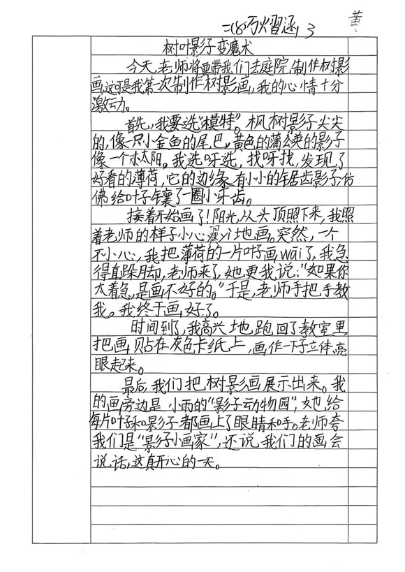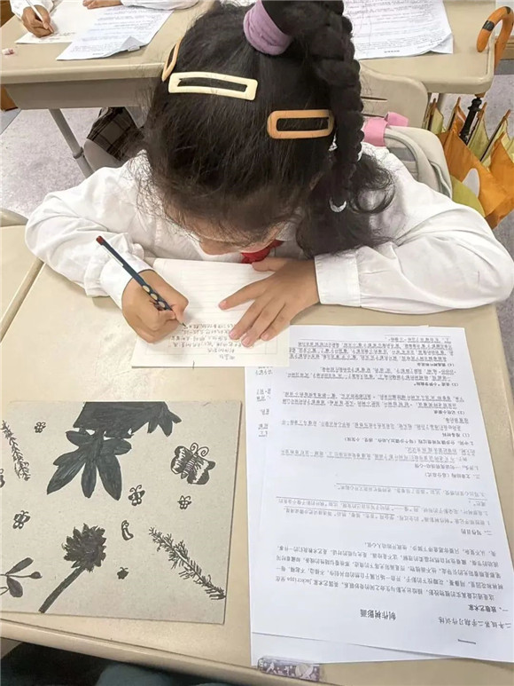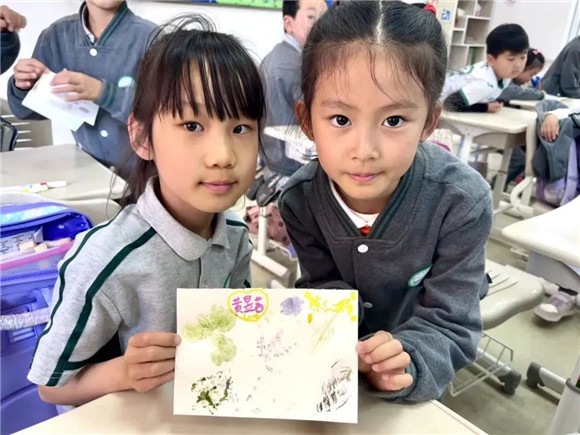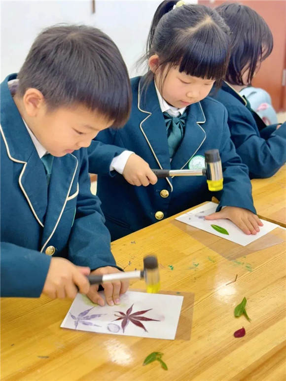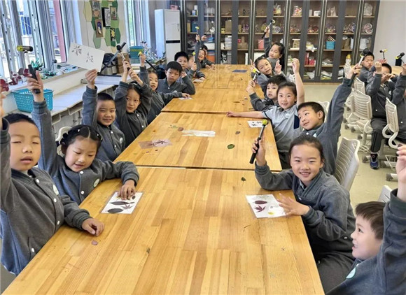 种植系列活动中,劳动还与艺术、科学、语文学科结合,孩子们带着锤子与宣纸走进庭院,用颜料拓印;树影画的创作则开启了光影的魔法课堂;"贴一贴、说一说、记一记"的任务步骤,将动手操作与语言表达无缝衔接,完成了从观察者到创作者的蜕变。