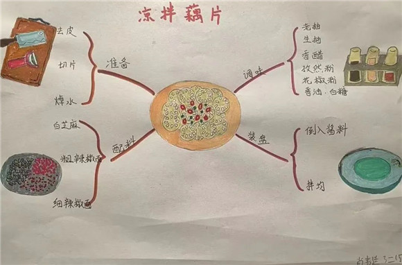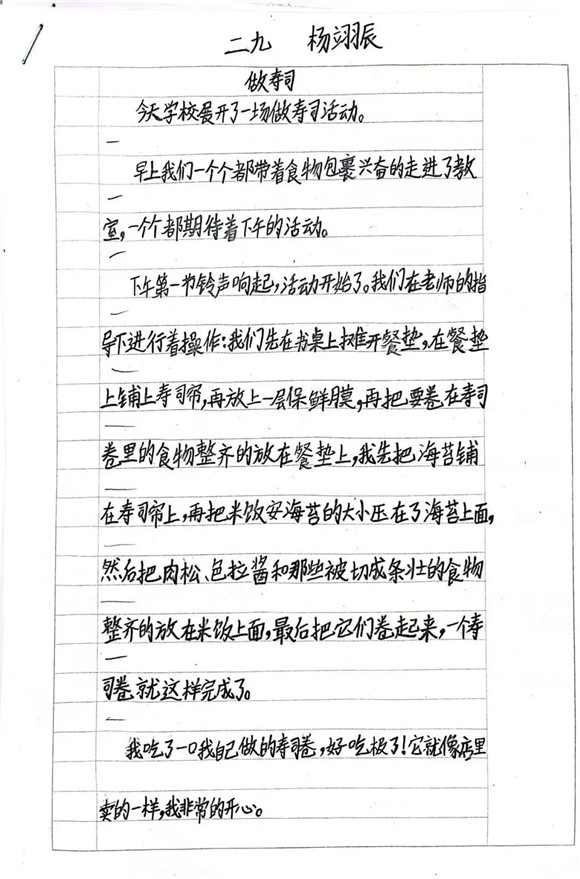 在"烹饪营养巧搭配"主题中,小笋芽们参与了一系列丰富有趣的活动:课堂上系统学习烹饪基础知识,认识各类厨房工具的名称及用途,掌握食材营养搭配的基础原理,了解红薯、寿司等食物的制作流程;学会用彩纸绘制食物形态,熟练完成红薯粥、三明治、凉拌菜、寿司等简单食物的制作,掌握卷、压、切等基础烹饪手法,还能将劳动过程转化为文字记录,在老师的指导下撰写图文并茂的"劳动日记",记录劳动过程与收获。提升了写作表达能力。