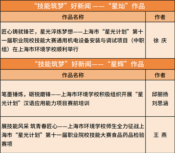 在"技能筑梦"好新闻评选中,学校教师作品同样出色:教师徐庆的作品《匠心铸就锋芒,星光淬炼梦想——上海市"星光计划"第十一届职业院校技能大赛通用机电设备安装与调试项目(中职组)在上海市环境学校顺利举行》荣获"星灿"作品奖项,教师邱丽扬、刘思涵的作品《笔墨锤炼,砺锐磨锋——上海市环境学校积极组织开展"星光计划"汉语应用能力项目赛前培训》和教师王燕的作品《展技能风采筑青春匠心——上海市环境学校师生全力征战上海市"星光计划"第十一届职业院校技能大赛食品药品检验赛项》分别荣获"星辉"作品奖项。