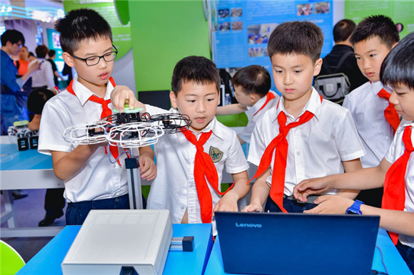 在上海教育博览会上,浦东新区竹园小学的孩子们通过编程进行无人机测试。